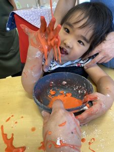色付けに使ったかき氷シロップの良い香りに誘われて手に付いた片栗粉粘土を