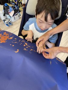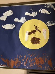 根っこのお月見製作、手形や足形で、皆で一つの製作を作りました🌾