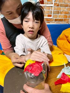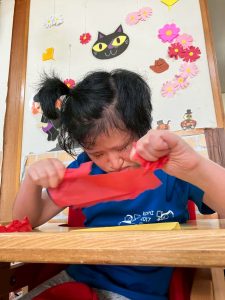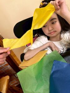好きな色の花紙を選んでビリビリと破り、貼り付けていく作業はとても楽しそう!